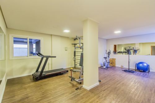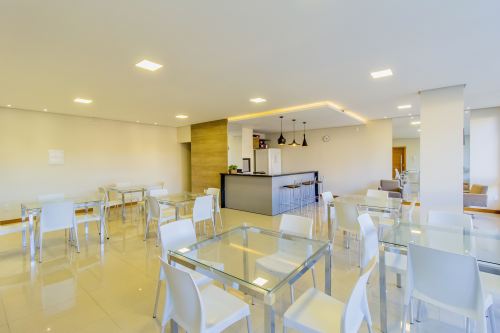 O condomínio possui salão de festas e fitness mobiliados.